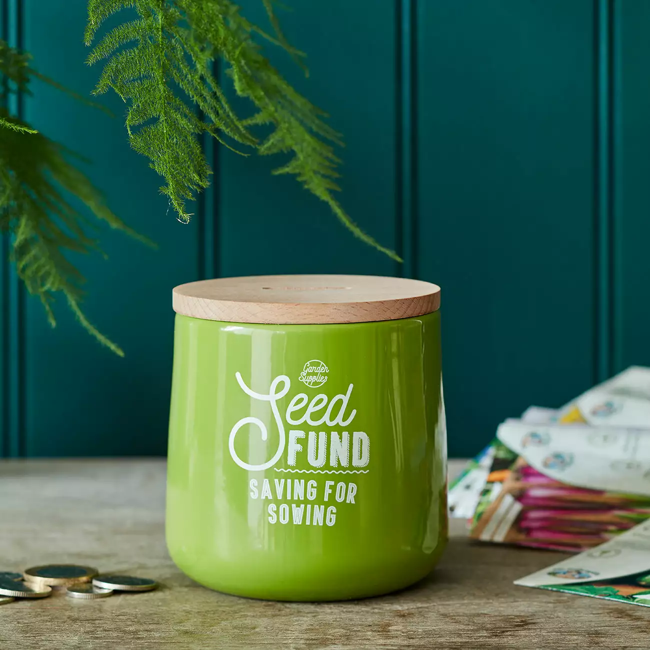 [/description][trade-description]This elegant money box gives gardeners somewhere to save for those little gardening indulgences! It’s a perfect gift for a gardening loved one, or of course it makes a very stylish way to kickstart your gardening savings fund.This gorgeously tactile container is all about the curves. It’s created in beautifully moulded steel for a flawless, seam-free finish, with a tough powder coating to keep the gorgeous colour looking good. The smooth FSC beech wooden lid adds a lovely natural touch.
