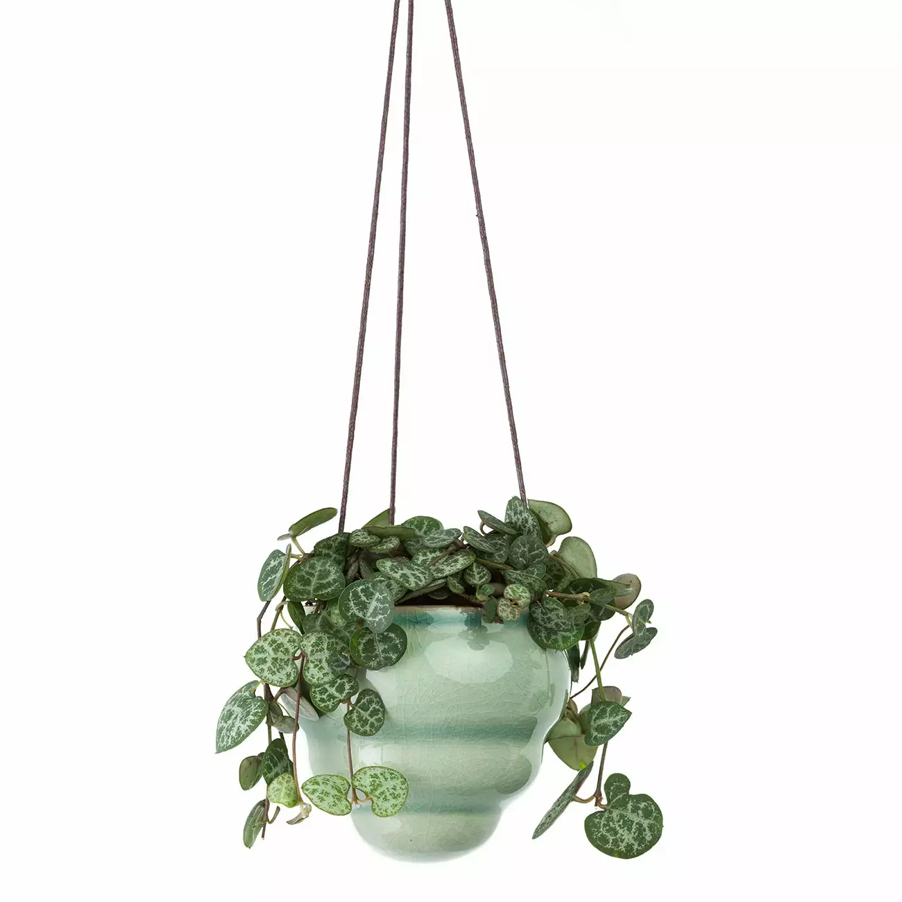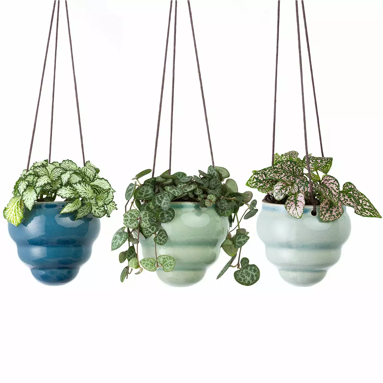 This pack of three indoor planters contains one pot with in a soft aqua green, one in dark blue, and one in a pale blue. An understated crackle glaze pools in the ridges of the design, accentuating the curves, and coated cotton hanging cords make the set a vegan-friendly option. Crafted in stoneware, these hanging indoor planters are fully waterproof.