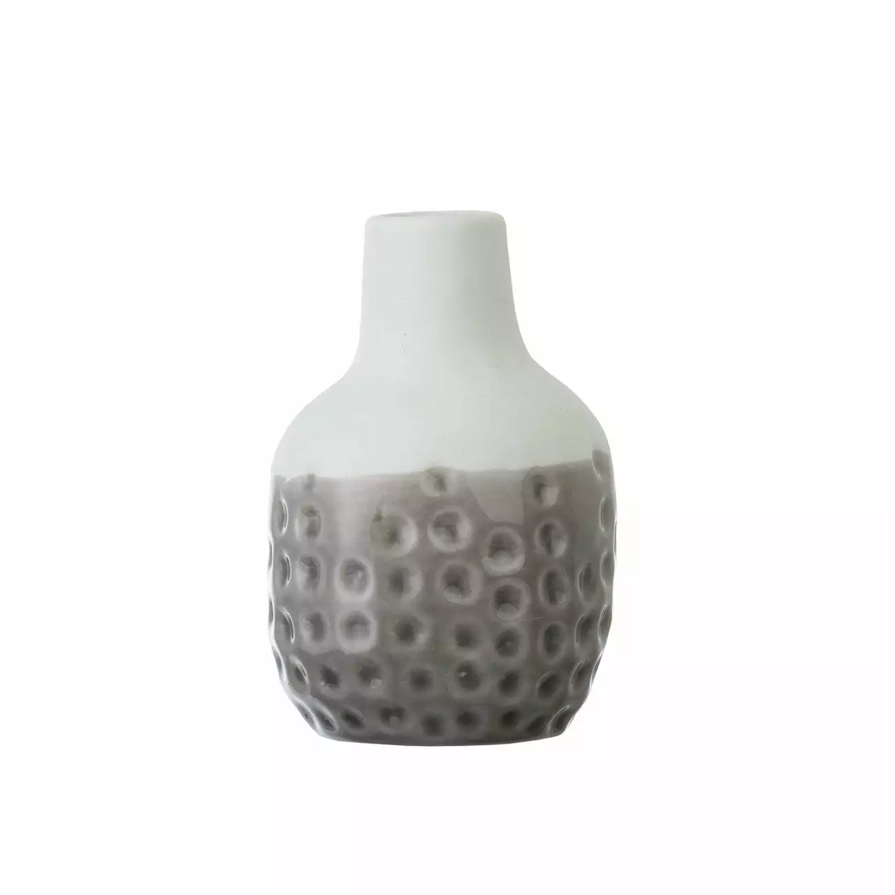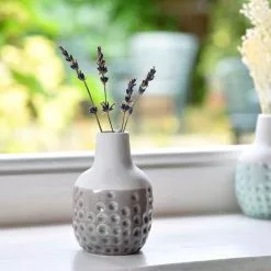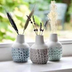 At just 10cm tall, these stoneware vases are delightfully dainty. Each vase holds one or two stems of fresh or dried flowers for a display with impact, just right for a table centrepiece. Echoing the dip glaze and eye-catching dimpled pattern of the much-loved Baby Dotty Trio, the vases feature complementary tones of aqua, petrol blue and a soft mushroom shade – greige, you might call it. Whether displayed singly or as a group, the Dotty mini vases look gorgeous even when empty, picture-perfect on fireplace, windowsill or shelf.