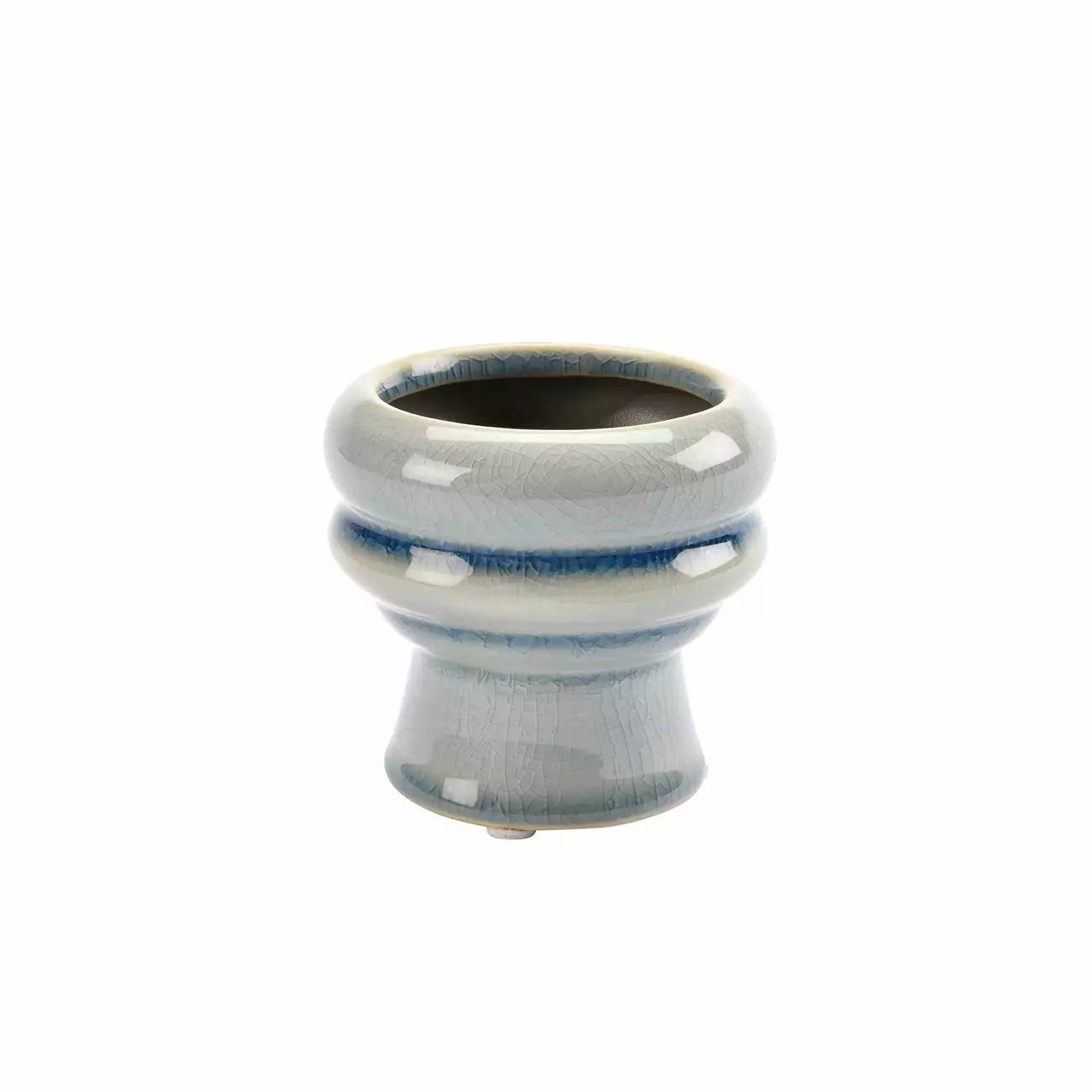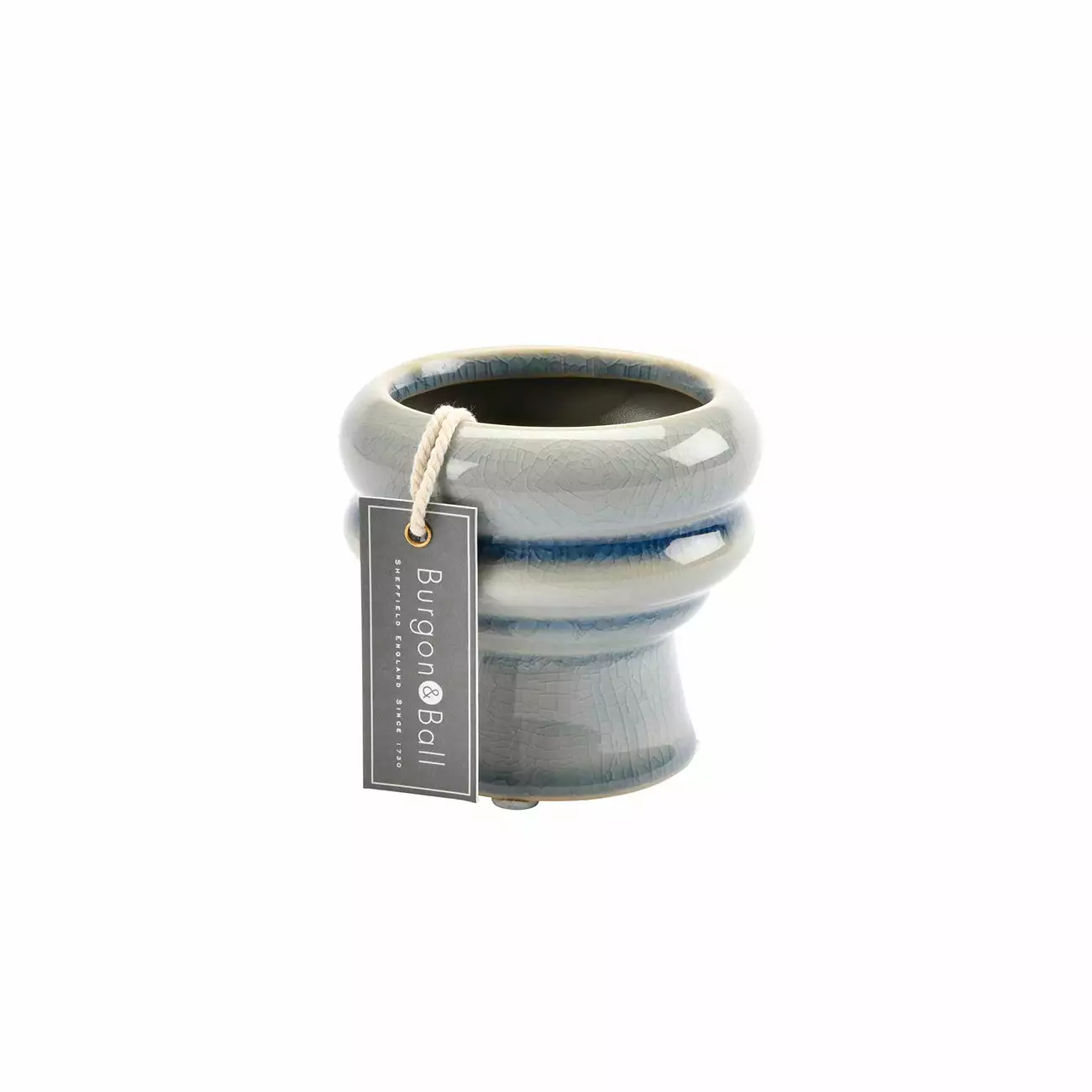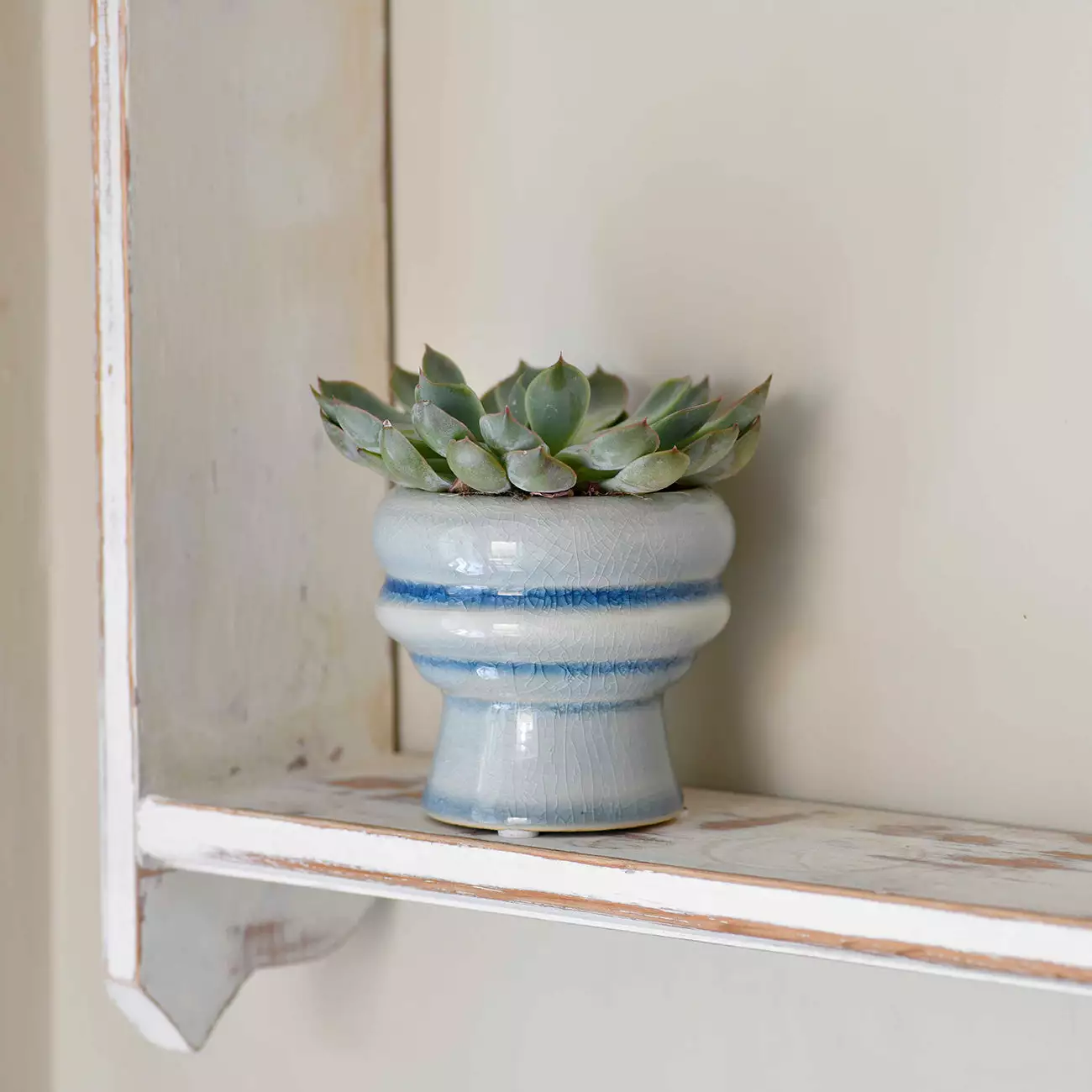 A subtle colour wash in a soft blue shade adds interest, becoming more intense where it collects in the ridges of the design. An understated crackle glaze brings a sophisticated finishing touch. The pot has foam pads on the base to protect your furniture.