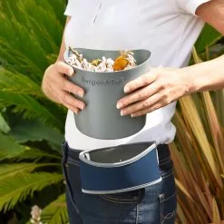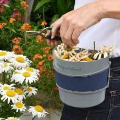 No more overloaded hands, dropped debris or garden produce, and no more bending down to a container on the ground.