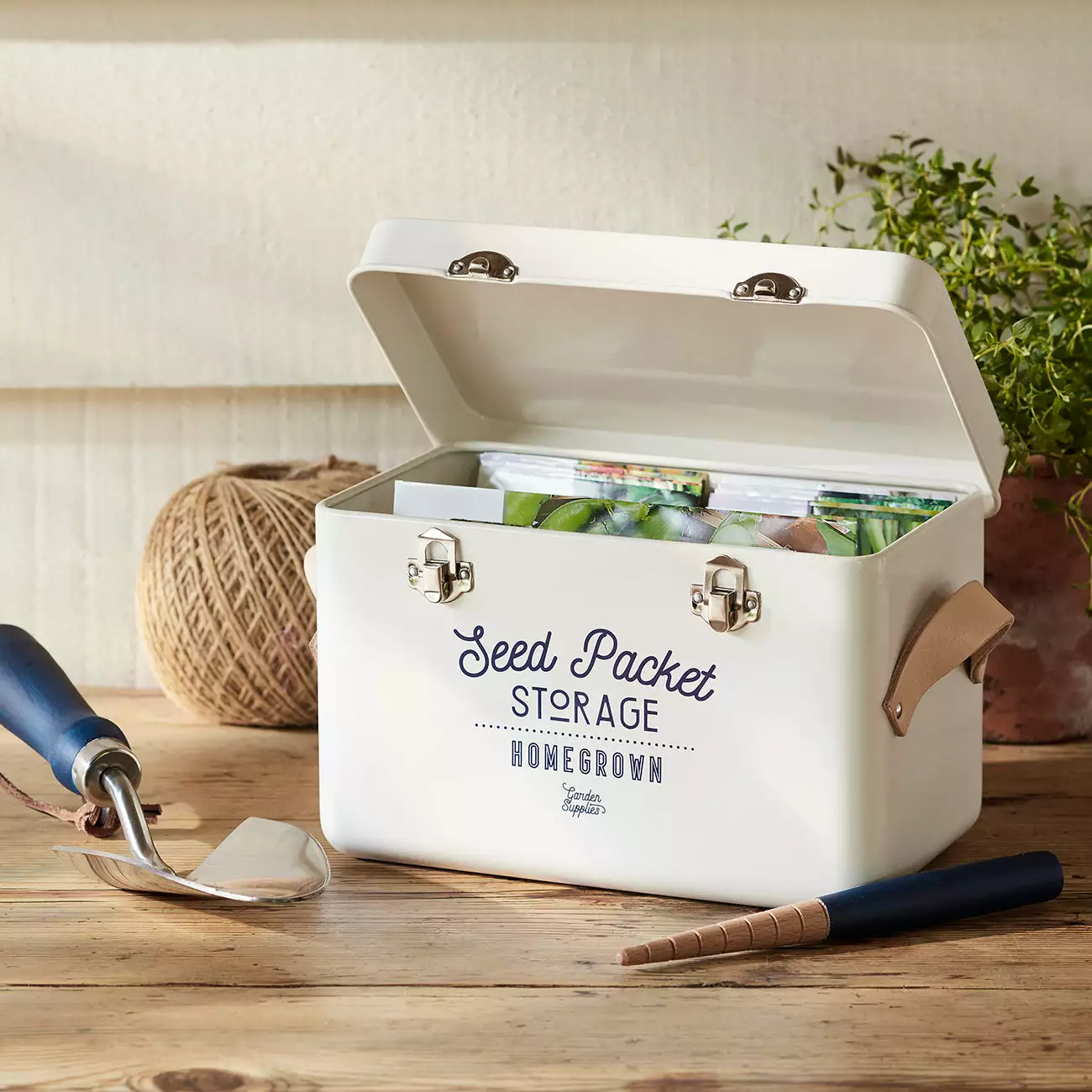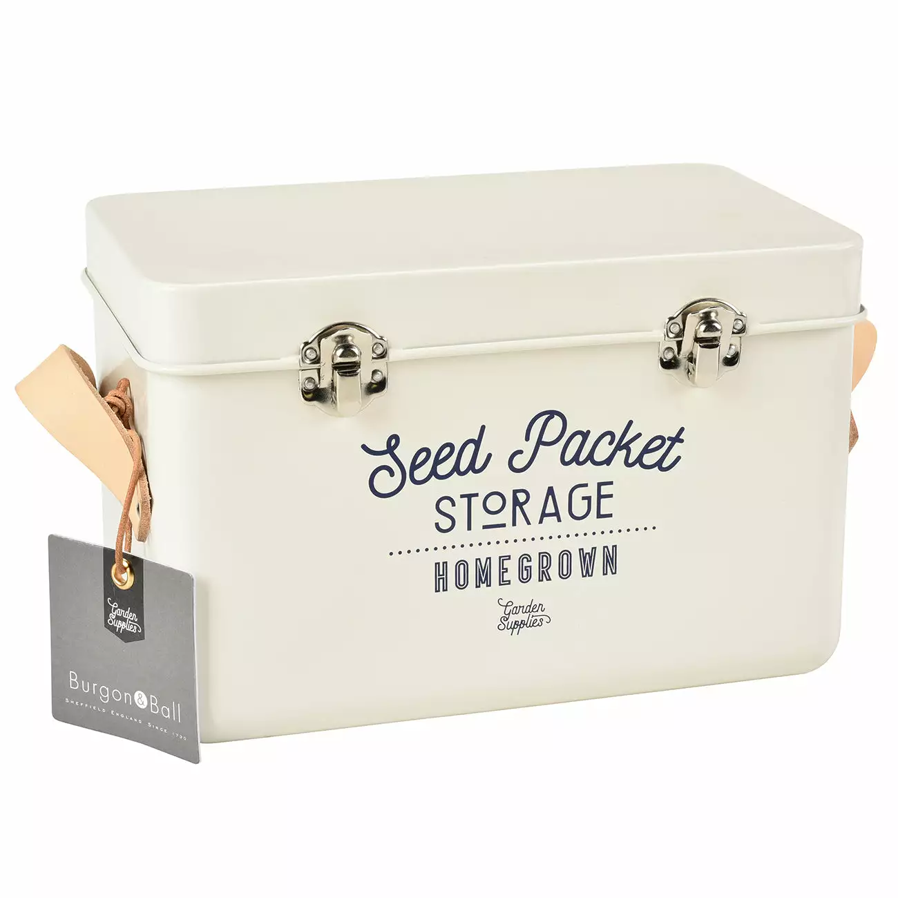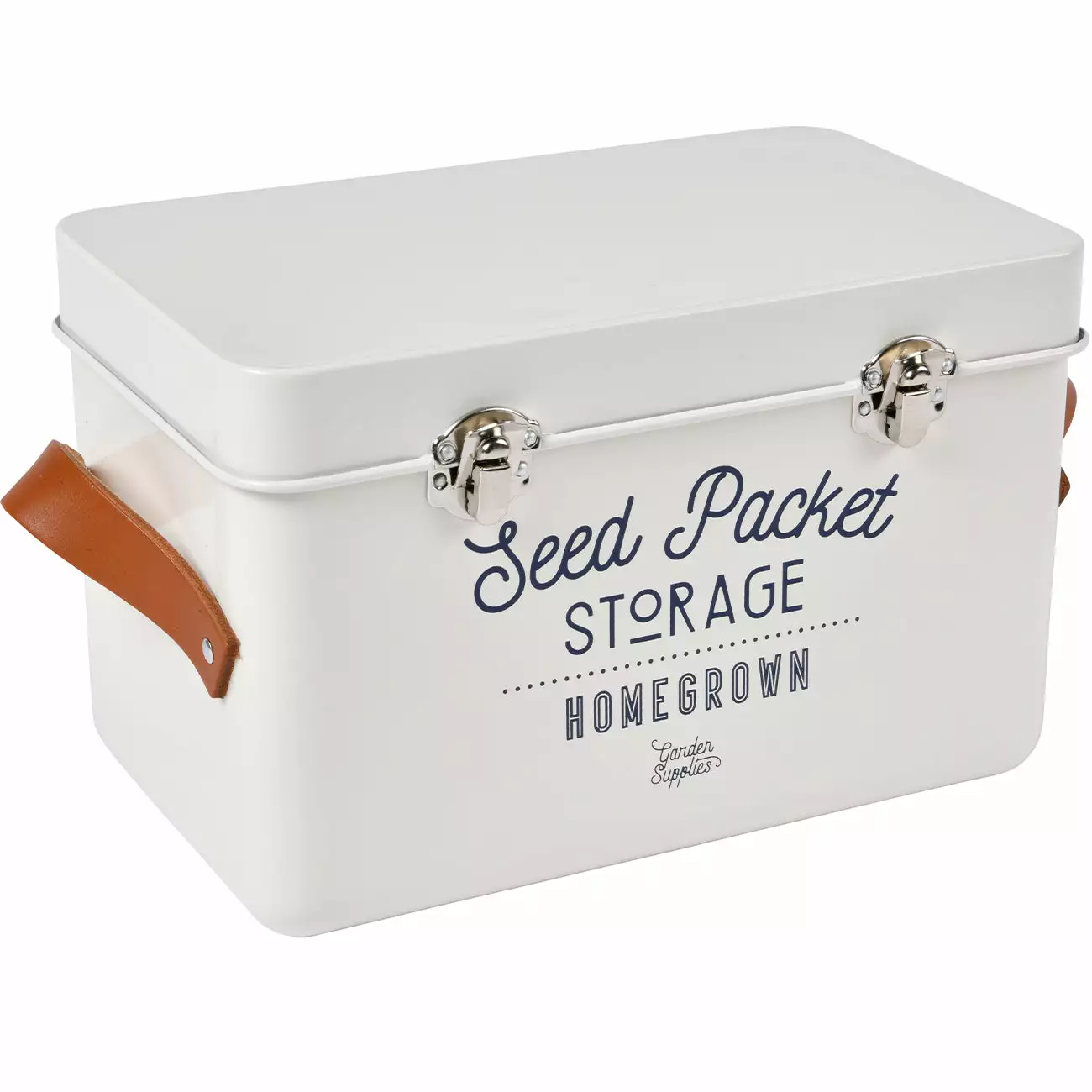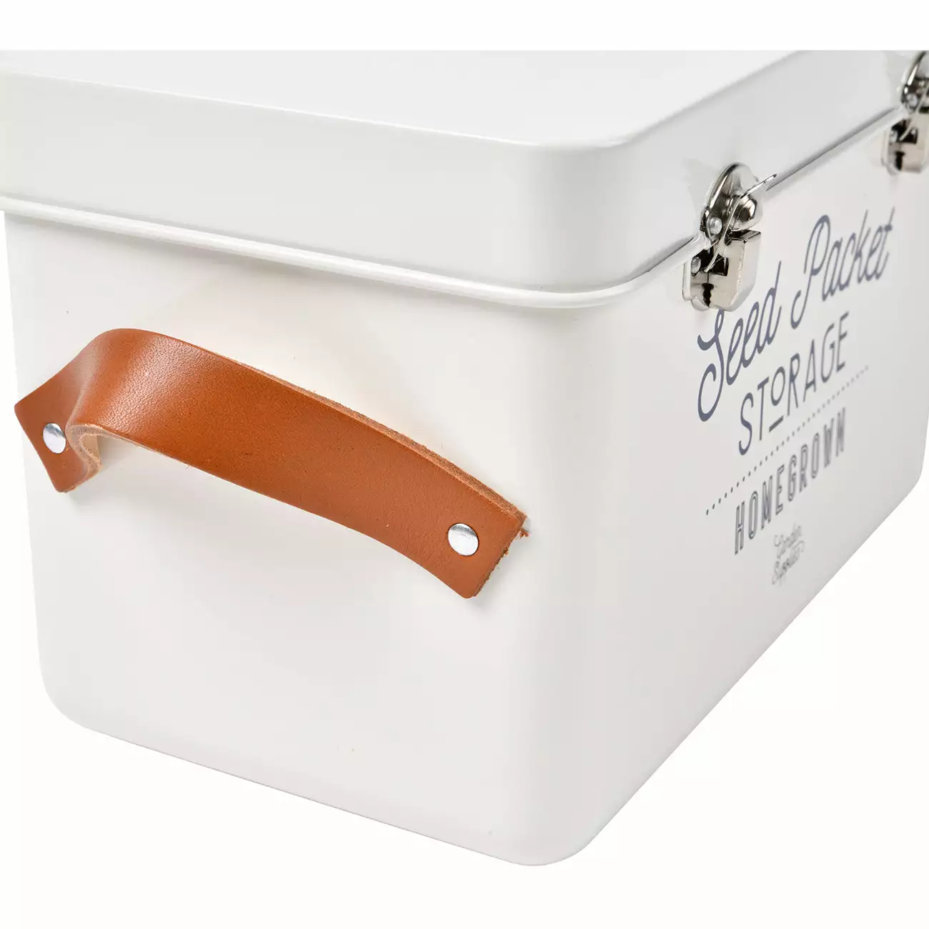 [/description][trade-description]This beautifully-designed storage tin is perfect for collecting, storing and organising your seed packets.This handsome storage tin has been designed to look extremely stylish in home or shed. On-trend typography and natural leather handles at either side give this tin a really distinctive look. Elegant curves have been created by a unique moulding process, for a flawless, seam-free finish. The result is irresistibly tactile, with a very contemporary feel.