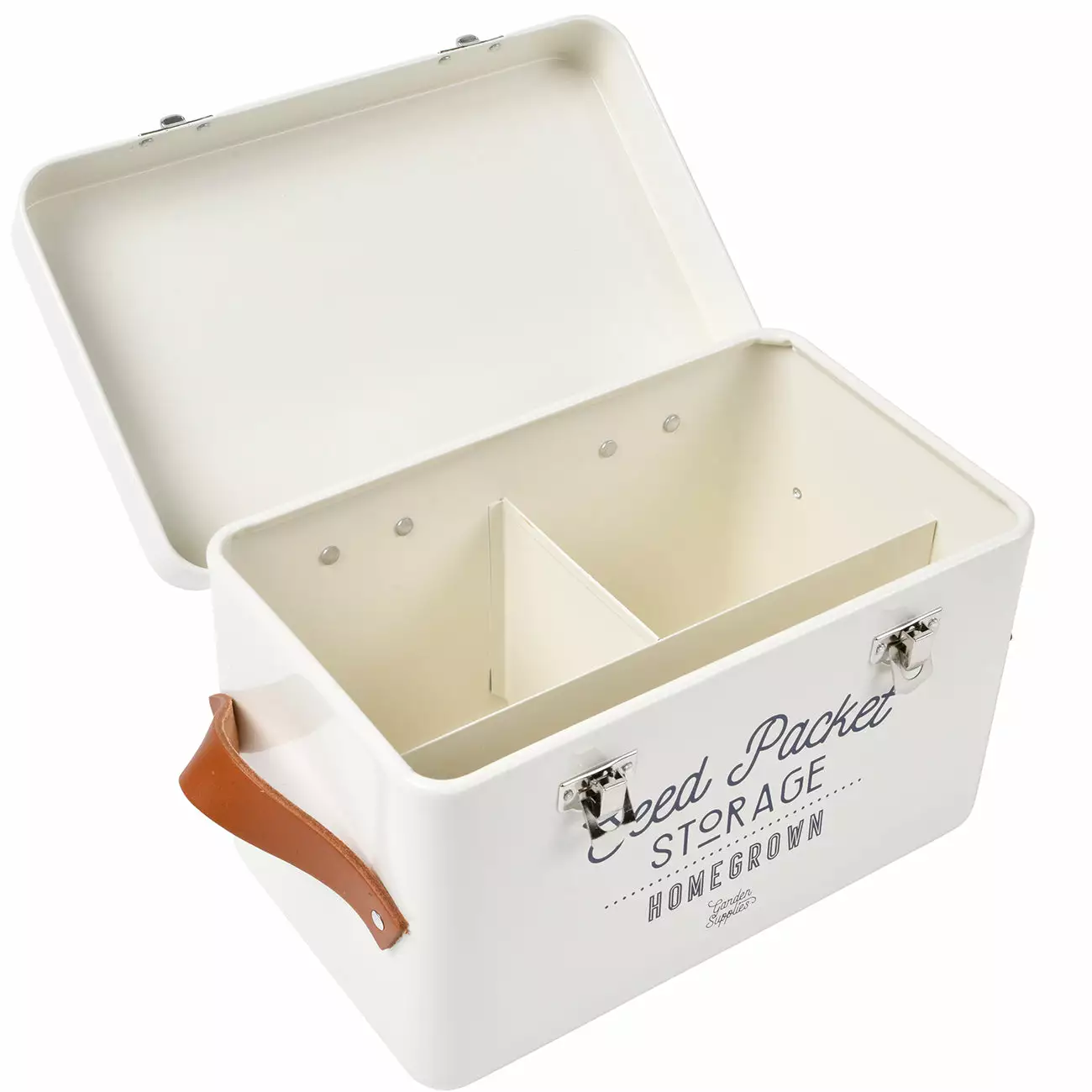 Gorgeous as it is, this storage tin is extremely practical, too. Two strong metal clasps hold the hinged lid securely shut, and inside there are three separate compartments to help organise your collection of garden treasures. One compartment even runs lengthways, giving a home to even the very largest seed packets.