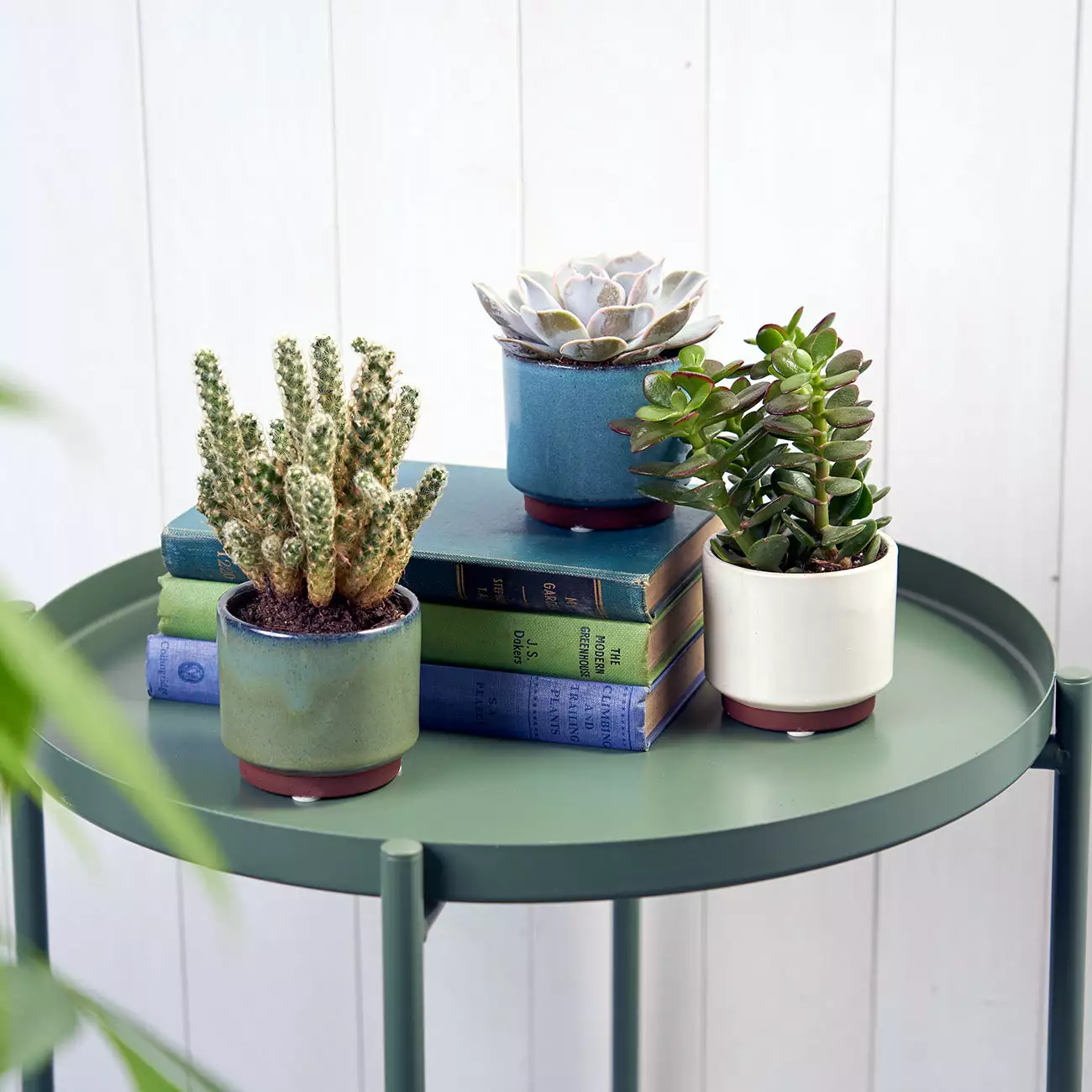 This subtly stylish collection of indoor plant pots features an understated speckled glaze, in soft shades of blue, green and cream to evoke the happy hazy days of summer at the coast. The Malibu succulent pot is available in a choice of three colours; green, blue and cream. Each stoneware pot is raised on a faux ‘stand’ in a contrast colour to lift the design out of the ordinary.