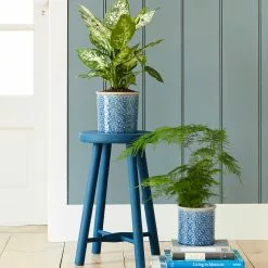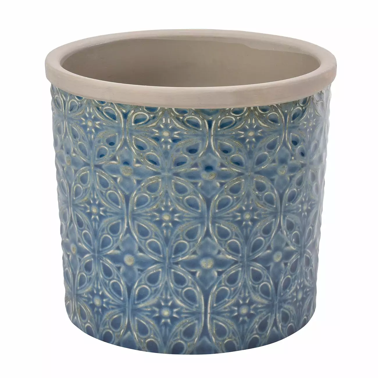 [/description][trade-description]Houseplants are firmly in vogue at the moment. These gorgeous cache-pots have a circular repeat design with a traditional feel – inspired by the fabulous tiles found in the Portuguese city of Porto.Made from stoneware and finished with a beautiful rich blue, crackle glaze.