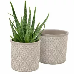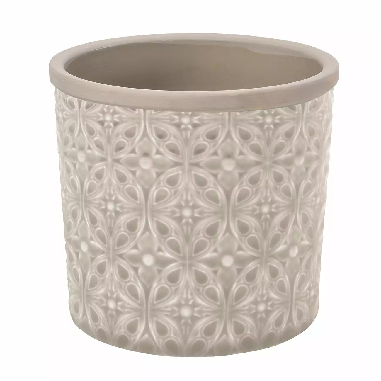 [/description][trade-description]Houseplants are firmly in vogue at the moment. These gorgeous cache-pots have a circular repeat design with a traditional feel – inspired by the fabulous tiles found in the Portuguese city of Porto.Made from stoneware and finished with a beautiful soft grey, crackle glaze.
