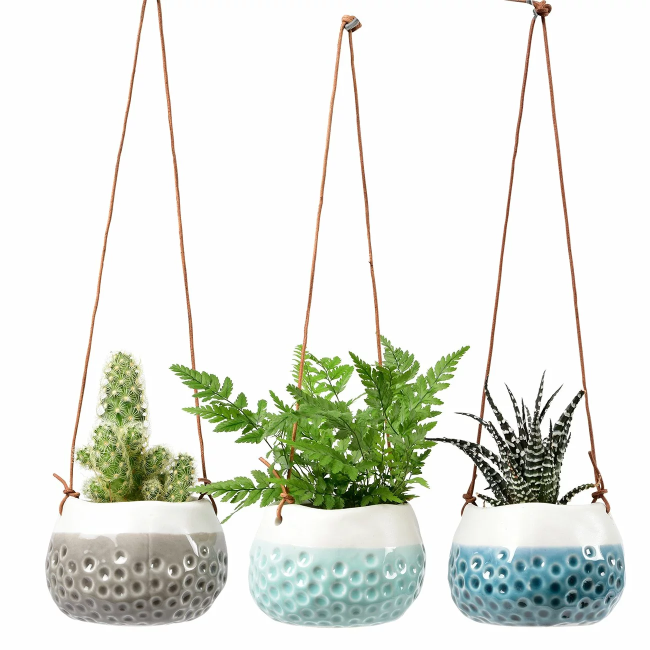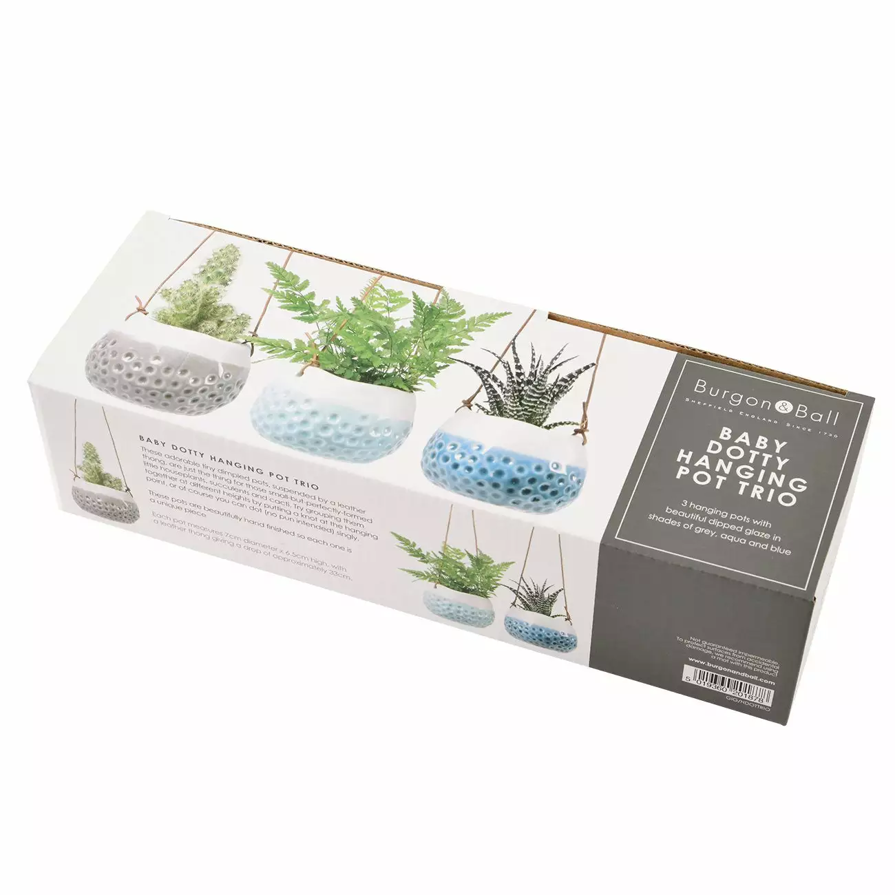 [/description][trade-description]Good things come in threes! This multi-pack of our much-loved ‘Baby Dotty’ pot is a quick and easy way to add up-to-the-minute design flair to your displays of hanging houseplants, to make the most of the interiors trend.Baby Dotty is an adorably tiny hanging indoor pot, just perfect for those small-but-perfectly-formed baby succulents. It has a charming hand-crafted feel, with a slightly wavy edge to the rim. On the lower half of each pot there’s a beautiful dip-glaze, which accentuates the interesting dimpled texture.