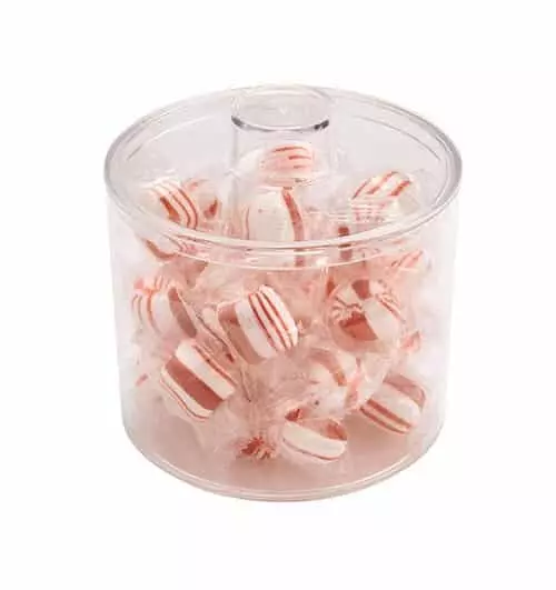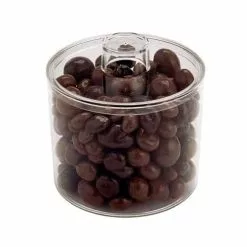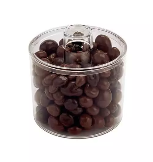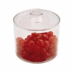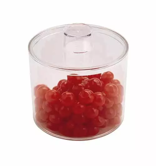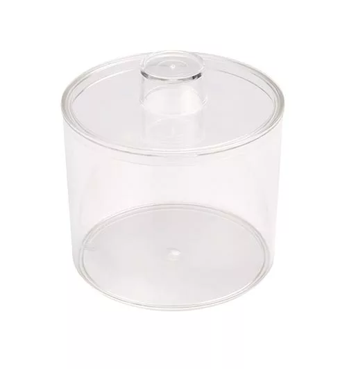 This clear plastic round container is an injection molded part, with a knob lid, made from high quality, food grade polystyrene. The 280C clear plastic round container can be used for candy & nuts, food services, food packaging, candy packaging, sustainable packaging, kitchen & food storage, science & education, lab supplies, or agriculture & research.