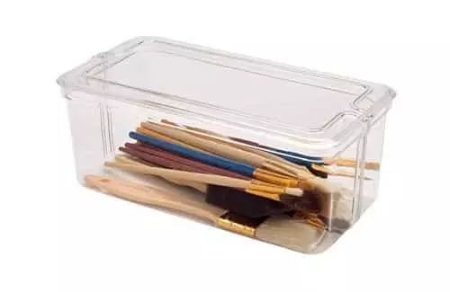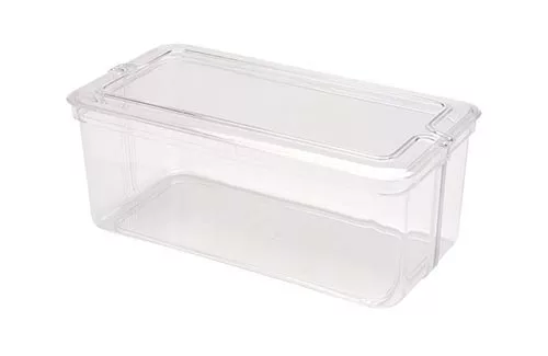 This clear square plastic container features an inside fit lid and decorative style lines. This container can be used as insect cages, sustainable packaging, lab supplies, science & education, agriculture & research, or decorative storage.