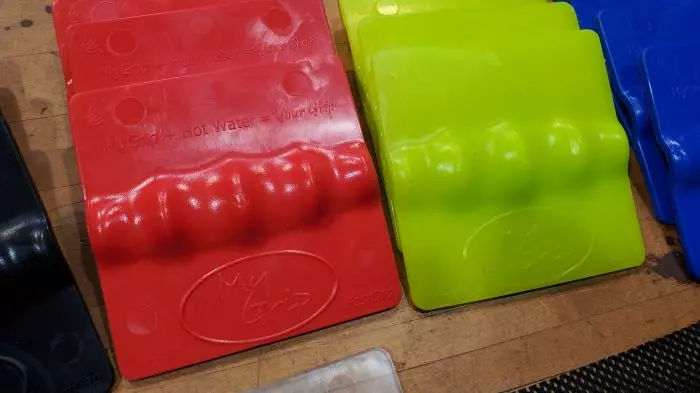To use, soften the My Grip sheet with hot water or a heat gun, and shape the sheet onto the handle that you’re covering. Once the My Grip sheet is installed, heat it again and grab and hold the handle to make a custom-fit grip. (To ensure you don’t burn your hand, make sure to splash or dip your hand in cool water first.) You’ll get an exact grip for your hand.