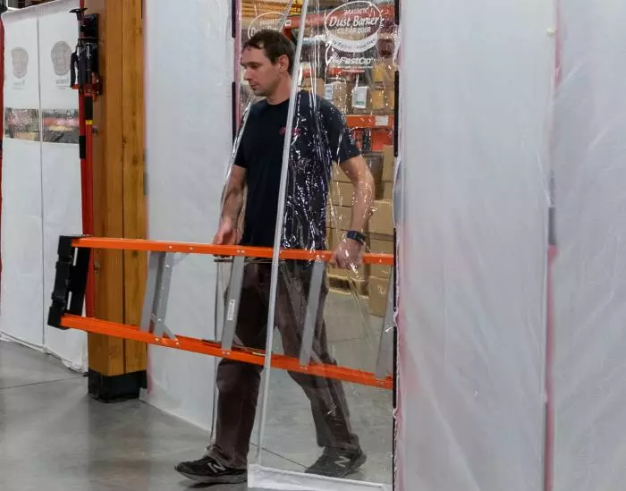 The Dust Barrier Door System replaces the hassle of installing plastic doors with zippers that you throw away after using. This reusable curtain utilizes strong magnetic strips to hold the protective door in place and enables them to close behind you – no need to put your tools, or your coffee mug, down.