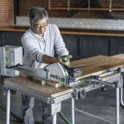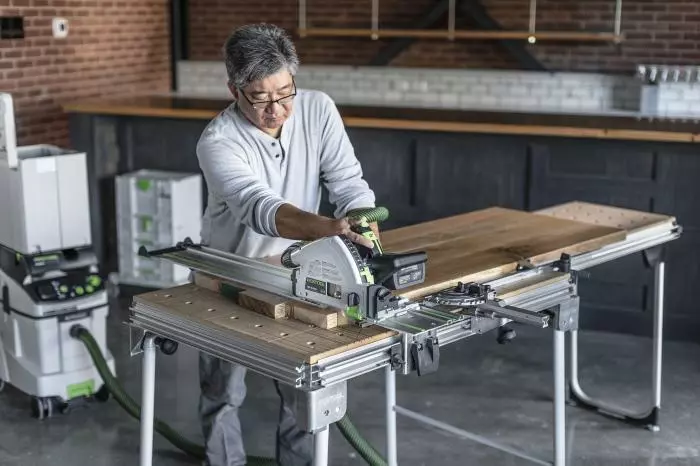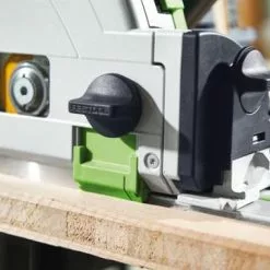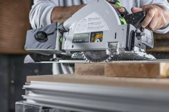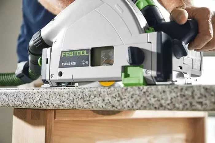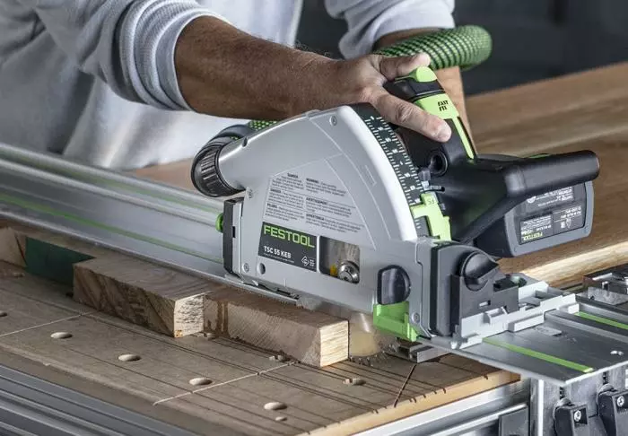 The TSC has also been improved in other ways. The new model allows you to make powerful, precise cuts at up to twice the speed with an extended battery range. The brushless EC-TEC motor, combined with 2 lithium-ion batteries, possess maximum cutting power despite being off the power cord. The saw uses a new generation of thinner-kerf saw blades that have a strikingly long life and give splinter free, laser straight cuts every single use. Dual splinter guards ensure zero tear cuts no matter what the material. Although nothing compares to working in tandem with a world-class Festool dust extractor, a Festool dust collection offers a credibly low-dust mobile working option.