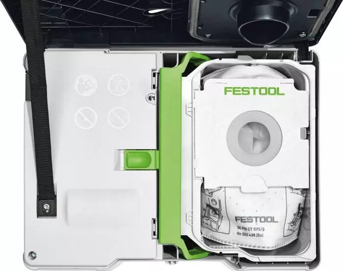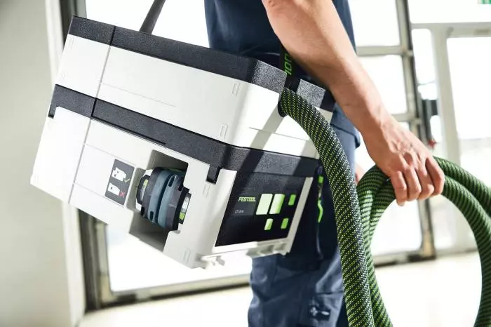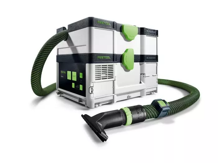 The CTC Sys is small and compact – but has a powerful section of 85 cubic feet per minute (CFM). The vacuum switches on and off with the Bluetooth autostart function or the convenient remote control on the suction hose. Both functions switch on the extractor automatically when the cordless tool starts up.