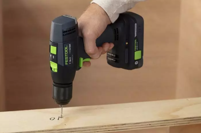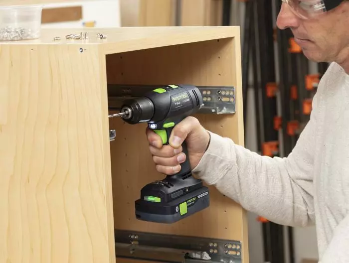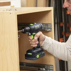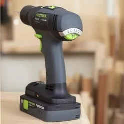 The drill’s long-lasting, energy-efficient brushless motor means less noise and greater reliability. The drill’s electronic monitoring protects the motor from overload and the advanced electronic clutch (not a mechanical clutch like most drills have) protects the motor and bearings from wear and tear. In addition, the torque is electronically controlled to produce the same torque regardless of which speed setting is used. You can switch back and forth between drill and drive modes without losing your clutch setting. The state-of-the-art lithium-ion cells used in Festool’s cordless drill batteries are individually selected to exactly match one another, resulting in a balanced load and absolute optimal charge and discharge cycles. They take a full charge in less than 70 minutes. The intelligent charger is also compatible with legacy Festool NiCad and NiMH batteries. The drill has a LED that illuminates the target area when you squeeze the drill’s trigger.