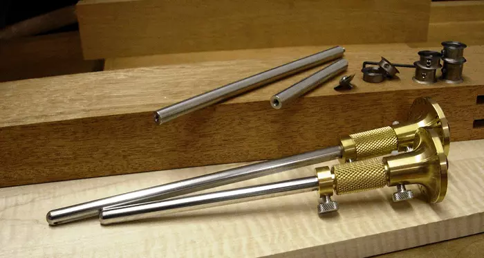 By locking 2 mortising cutters on the stem, the Tite-Mark turns into a mortise gauge. The mortise cutters are included with the Tite-Mark III or can be added as an option. If you have four mortising cutters, you can mark a double mortise all in one shot. There are two basic versions of the Tite-Mark, a regular one with a 7″ stem, and a long version with a 9″ stem. The regular one is fine for normal use, but you may want to consider the longer version if you want to also use the gauge with its mortising. The “Deluxe” versions of the Tite-Mark include one marking blade, one scoring blade, two single-bevel adjustable mortise blades, a set of fixed-width mortise blades (four sizes), a set of extensions, and an Allen key to form a complete kit. Made in USA.
