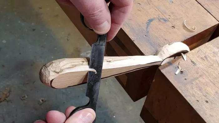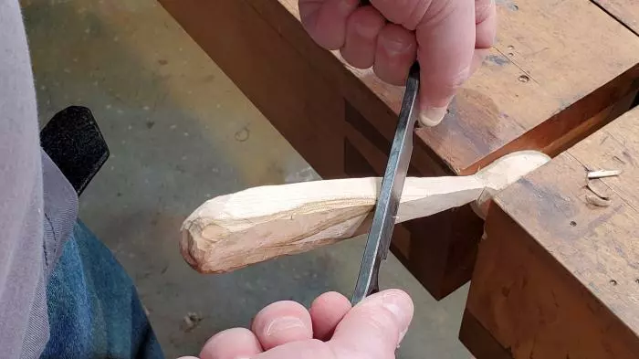 When you harden steel it typically warps a little. After hardening our drawknife usually has a very slight concavity on the bottom. This is intentional and it helps sharpening the tool.