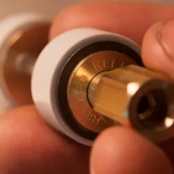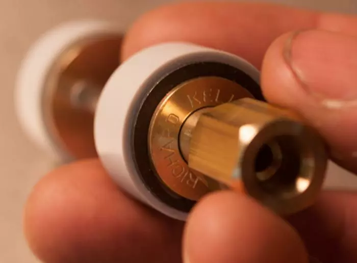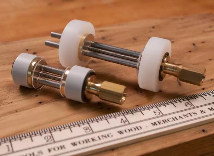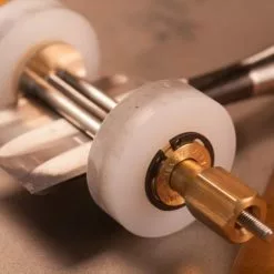 Kell Honing Guides are available in two sizes, both expertly machined from solid brass and stainless steel. The Small Guide fits blades up to 1″ wide. The Large Guide can clamps blades up to 2 5/8″ making it great for sharpening plane irons. The larger diameter wheels(1.56″/40mm) make tuning the bevel angle slightly easier over previous models, but require a little more extension of the tool.