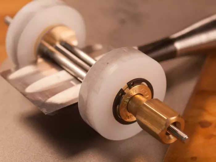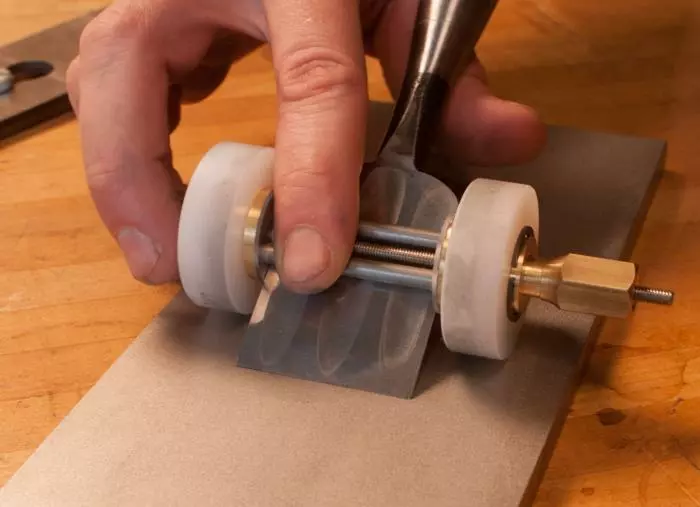 Unlike top-to-bottom clamps, Kell clamps eliminate the hassle of getting the blade square to the jig. Two plastic washers even out any irregularity in the iron so that the clamp holds the tool far tighter than any other honing guide on the market. To determine the honing angle, just measure the amount of extension from the jig. It’s really reassuring to work with a tool that is so solid in the hand and so positive in its clamping action without lots of fiddly adjustments that can get clogged and slip.