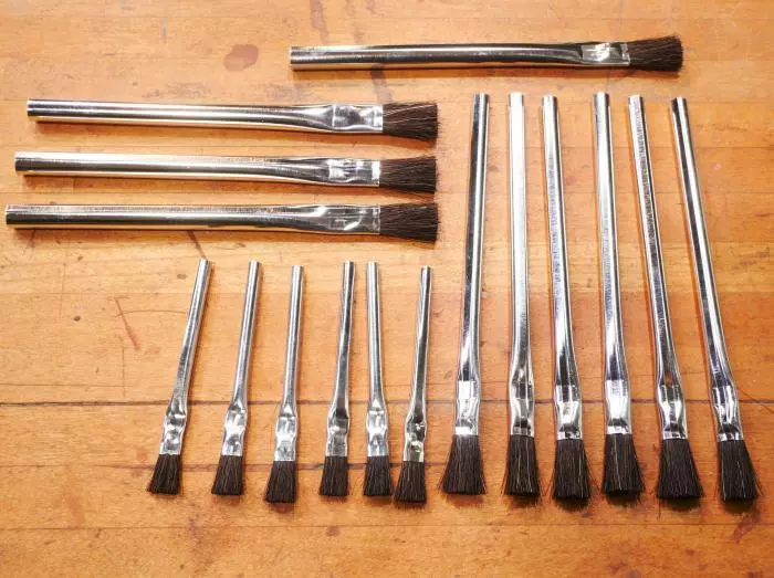 Use them for gluing, pasting, soldering or acid applications. The brushes have horsehair bristle held in place with a staple and a tin handle.
