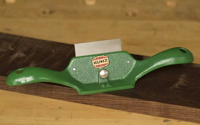 Stanley has been making this scraper plane for over a hundred years. Then they moved production to Mexico and the quality dropped below acceptability (which is impressive considering it’s not that complicated a tool). This version by Kunz Is very nice and well made. Basically all a scraper plane is is a simple frame that holds a scraper (included) at the correct angle to your work. A little screw is used to bow out the scraper if you wish to control the cut. The main reason for using a cabinet scraper in a frame like this is that hand-held scrapers are tiring to use on large surfaces. With this tool you will find it a lot easier to get a consistent shaving and you don’t have to worry about the heat buildup that makes hand – held scrapers hard to told when working quickly. To use: burnish a burr on one edge of the blade as you would on a cabinet scraper. Made in Germany.