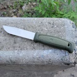 The blade is made of Swedish Sandvik 12C27 stainless steel and is 109 mm (4.3 in) and 2.5 mm (0.09 in) thick. Overall length: 226 mm (8.9 in). Color: Khaki Green/Green. Made in Sweden.