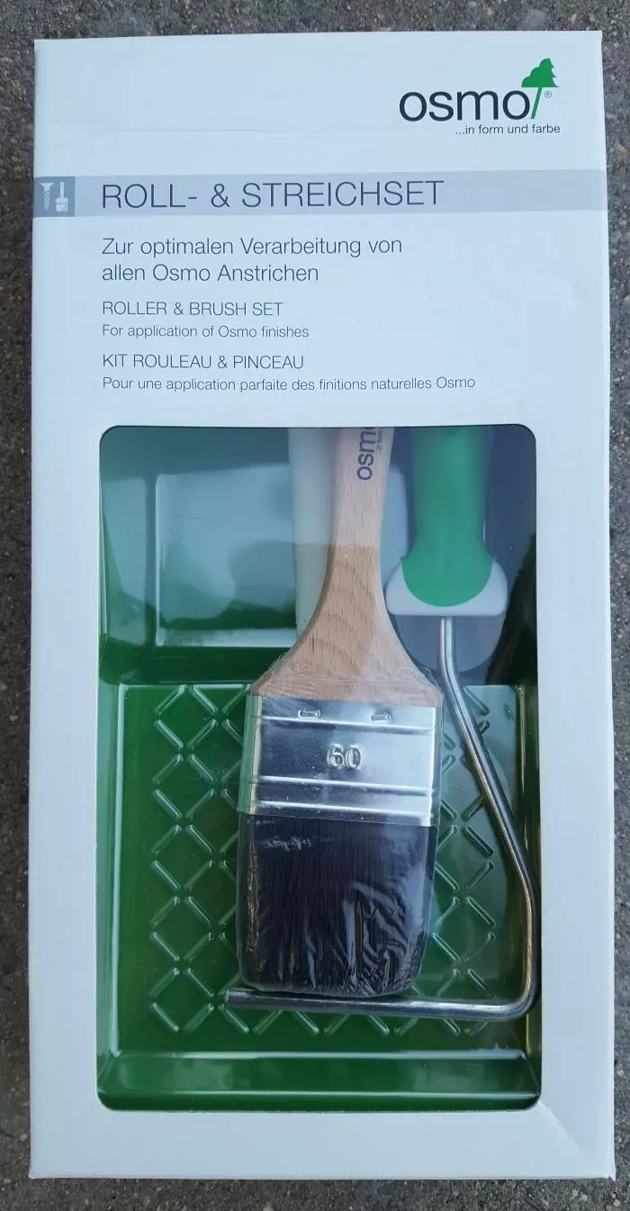 Both the brush and roller are specifically optimized to get the product into the wood pores, enabling you to apply Osmo thinly, thoroughly and evenly with the wood grain. Just remember to not overload them with material. The set includes a 60 mm natural bristle flat brush, a 100 mm (10 cm) microfiber roller, a 60 mm natural bristle flat brush and a ridged roller tray with a disposable clear plastic insert that makes cleanup a breeze. You can cover each component with plastic wrap or a sealed plastic bag between the first and second Osmo coats.