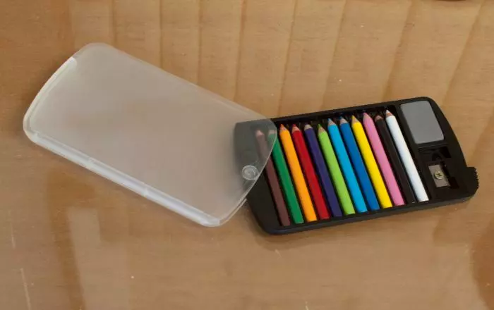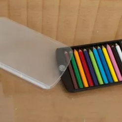 Mini Pencil Sets have twelve different colors, a sharpener and an eraser, all in a fitted case the size of a credit card. The pencils are 1 3/4″ long x 5/32″ in diameter. The pencils are small but of high quality and leave a dense line of color. The credit card sized case is about 1/4″ thick when closed.