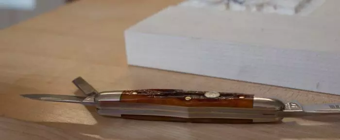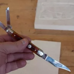 The smaller pen and coping blades open on one end, each bearing on a single spring. The main clip-point blade bears on both springs with a double wide tang. The center brass liner has been tapered – a subtle feature easily overlooked, yet indicative of expert cutlery. The result is a knife that for its size, weight, and number of blades, is incredibly sturdy. Anyone looking to do a bit of whittling would be hard-pressed to find a finer folding friend.