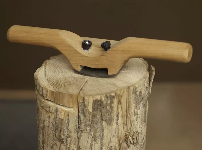 beech, that is treated with linseed oil. To minimize wear on the mouth of the plane, it has also been treated with a hardener. The shavings come out of the back of the travisher, as with a traditional spokeshave, which means it is self-emptying to prevent blockages.