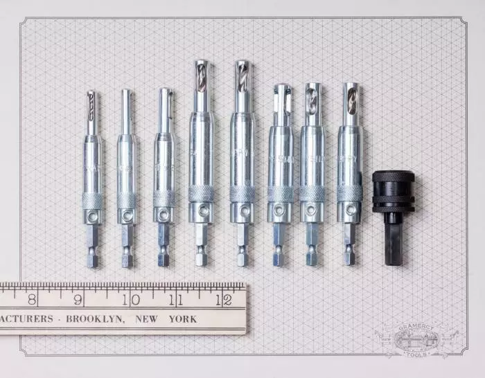 The Shelf Pin Guides operate on the same principle, but instead of the tapered drill bit of the Hinge Bits, the internal drill bit is a brad-tip drill. The brad tip is made of HSS for a precise, clean hole. Designed for use with shelf pin jigs.