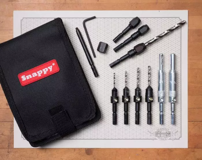 The Handy Man’s set has a little of everything, with two Gold Screw Countersinks, the Drill Bit Adapters, one Self-Centering Hinge bit, and a Square Driver Bit. This gives you the full setup for installing fasteners with speed and clean results. Kept in a hand belt pouch so you can be slinging bits all around the house. Is rumored to work equally well for Handy Women.