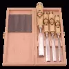 We have three sets. The first mixed set, originally designed for bird carvers, is far and away everyone’s favorite. It contains the following tools: Straight gouge: 1/4 x7, 1/4 x 9, Curved “V” tool: 1/16″ x 42, Straight Skew 3/16″ x 2A, Curved Gouge: 3/8 x 18, and a 3/4 Ray Gonzalez hooked skew.