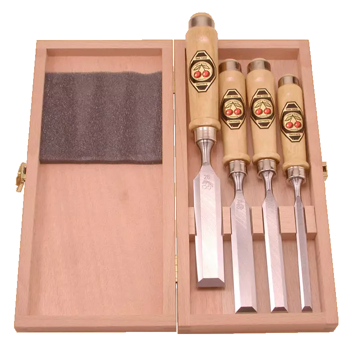 In Germany, it is traditional for high-end chisels to be sold with the metal blades already polished. Customers expect it, and all our Two Cherries professional chisels and carving tools are sold polished. However, one of our distributors came up with a really excellent idea: since Americans are used to English chisels, which aren�t polished, why not offer an unpolished set at a great value? So here it is. These are the same beveled edge Two Cherries bench chisels as we normally carry, correctly ground, with good backs, and with a slightly shorter wooden handle then the regular Two Cherries chisels. The difference is that the chisels aren�t polished, the handles as we said are a touch shorter, and they are only available in sets of four in a wooden box. This is being done as a special promotion so that more people, especially those moving up to their first set of really fine chisels, can get acquainted with the Two Cherries line. Needless to say, this is also an excellent gift idea.
