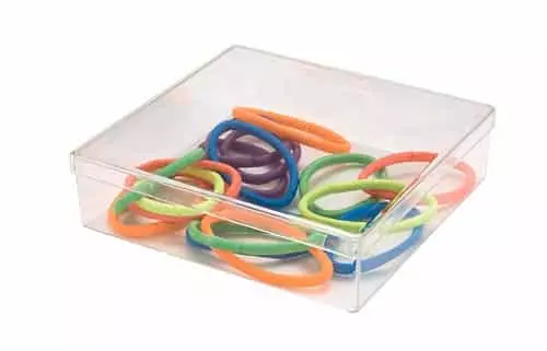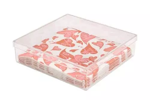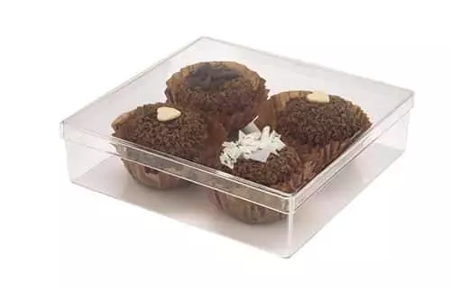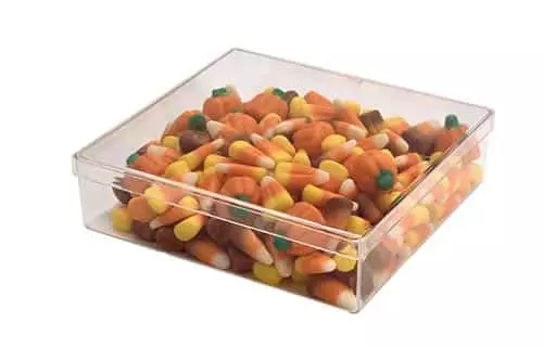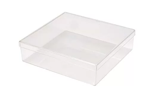 This square clear plastic container featuring an over fit lid is made from high quality, food grade polystyrene and has a capacity of 19 oz. Uses for this container include candy packaging, arts and crafts, promotional items, and sustainable packaging. This product is sold blank, but a variety of imprint options are available. Custom colors are available with a minimum 1000 piece order.
