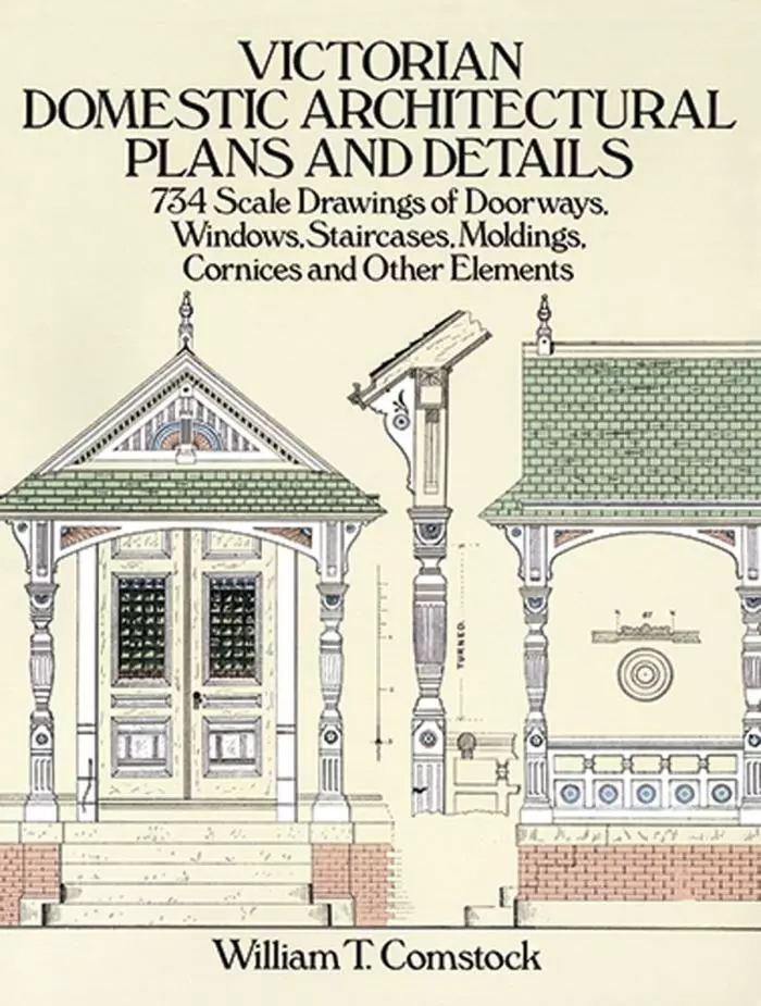 As you might guess with a name like (big gulp), “Victorian Domestic Architectural Plans and Details: 734 Scale Drawings of Doorways, Windows, Staircases, Moldings, Cornices, and Other Elements,” the book is filled with extremely clear, detailed and drawn-to-scale engravings that show floor plans, elevations and perspectives of both residential and business buildings (in various styles, including Queen Anne, Eastlake, Elizabethan, Colonial, Jacobean, Southern, and more). Supplementing the large number of complete designs are nearly 700 large-scale drawings of virtually every architectural detail, many embodying the unique “gingerbread” that characterizes Victorian buildings. Included are clear, precise renderings of balusters, brackets, dormers, fireplaces, finials, gables, mantels, moldings, newels, porches, rafters, rosettes, staircases, transoms, verandahs, wainscoting, windows, and hundreds of other features.